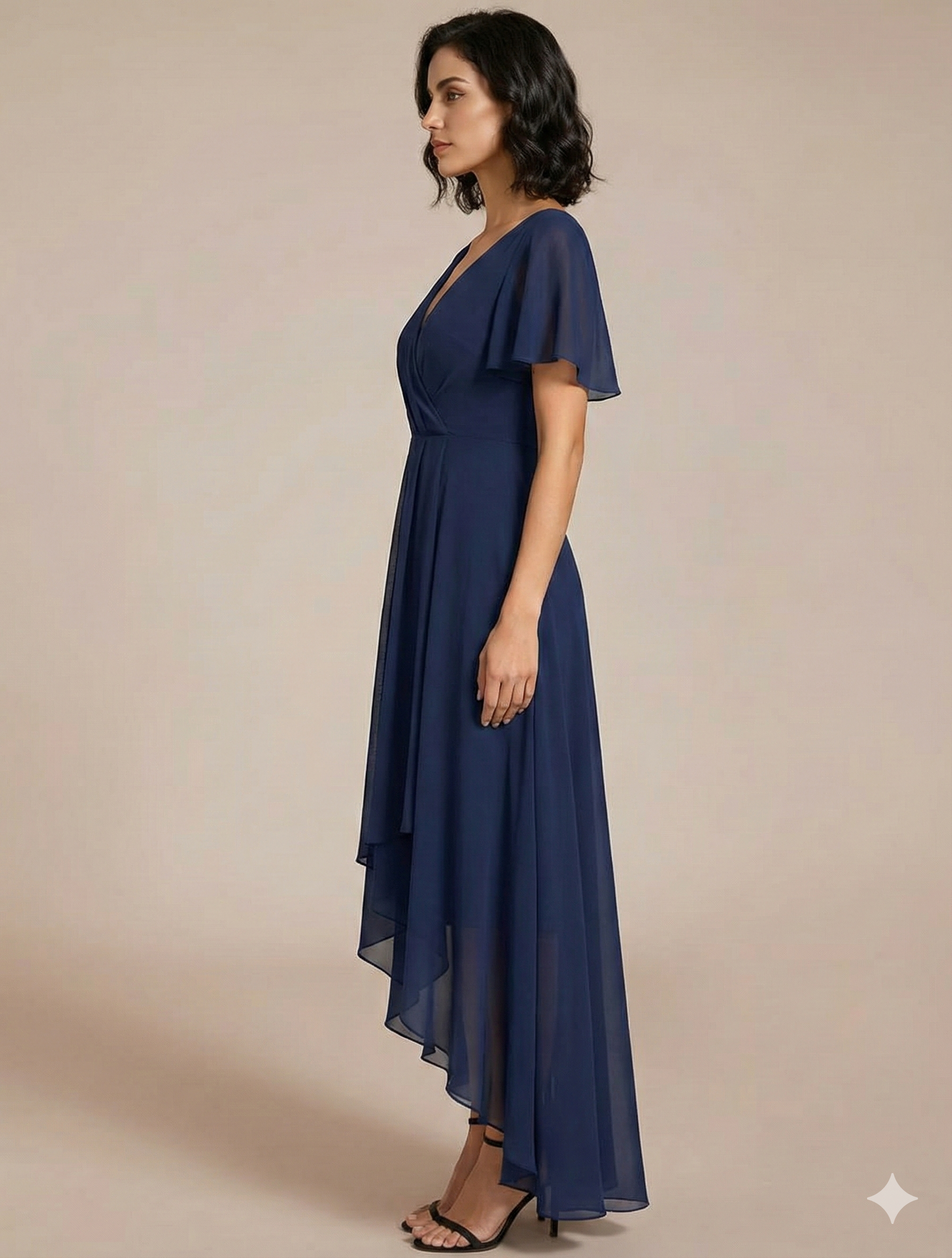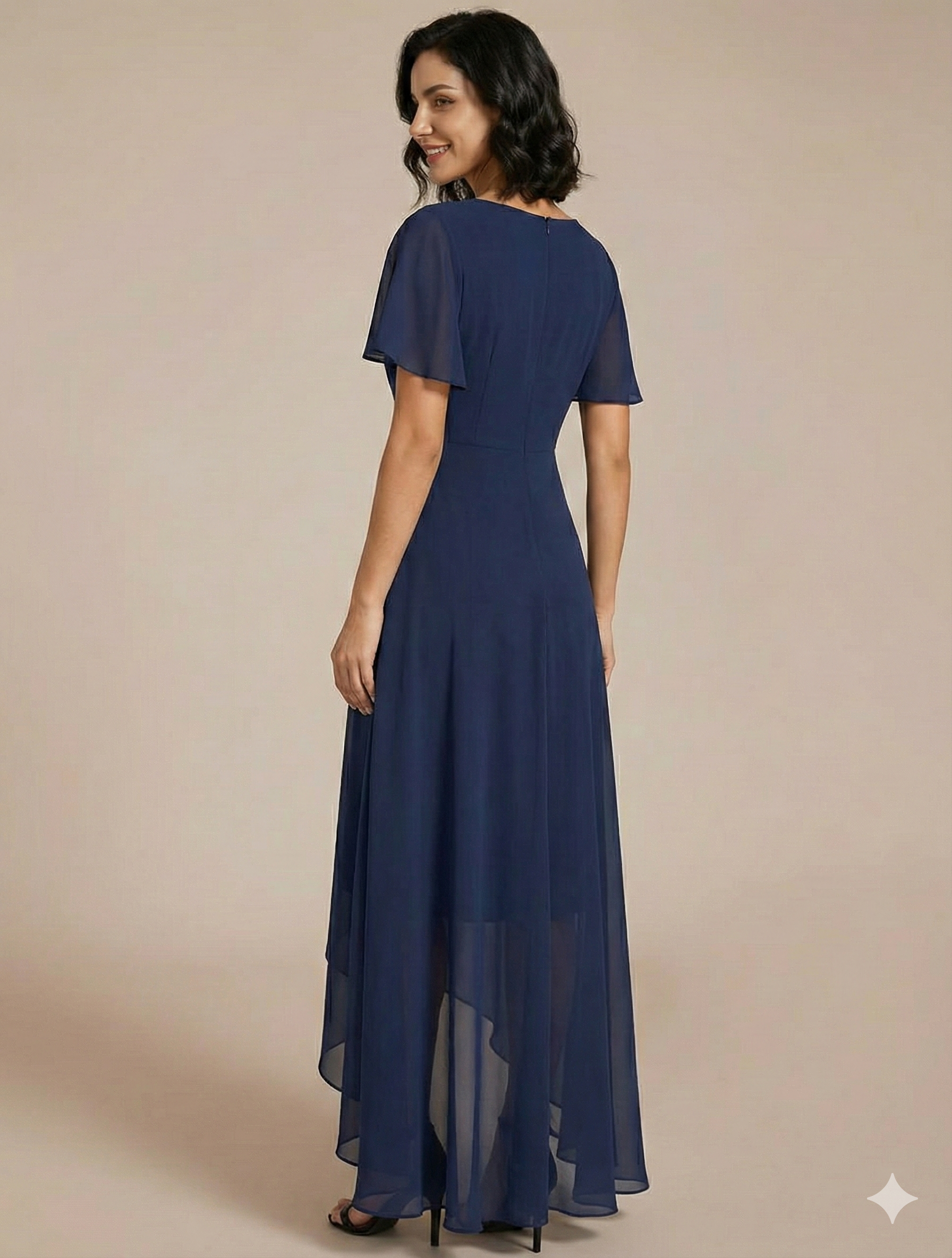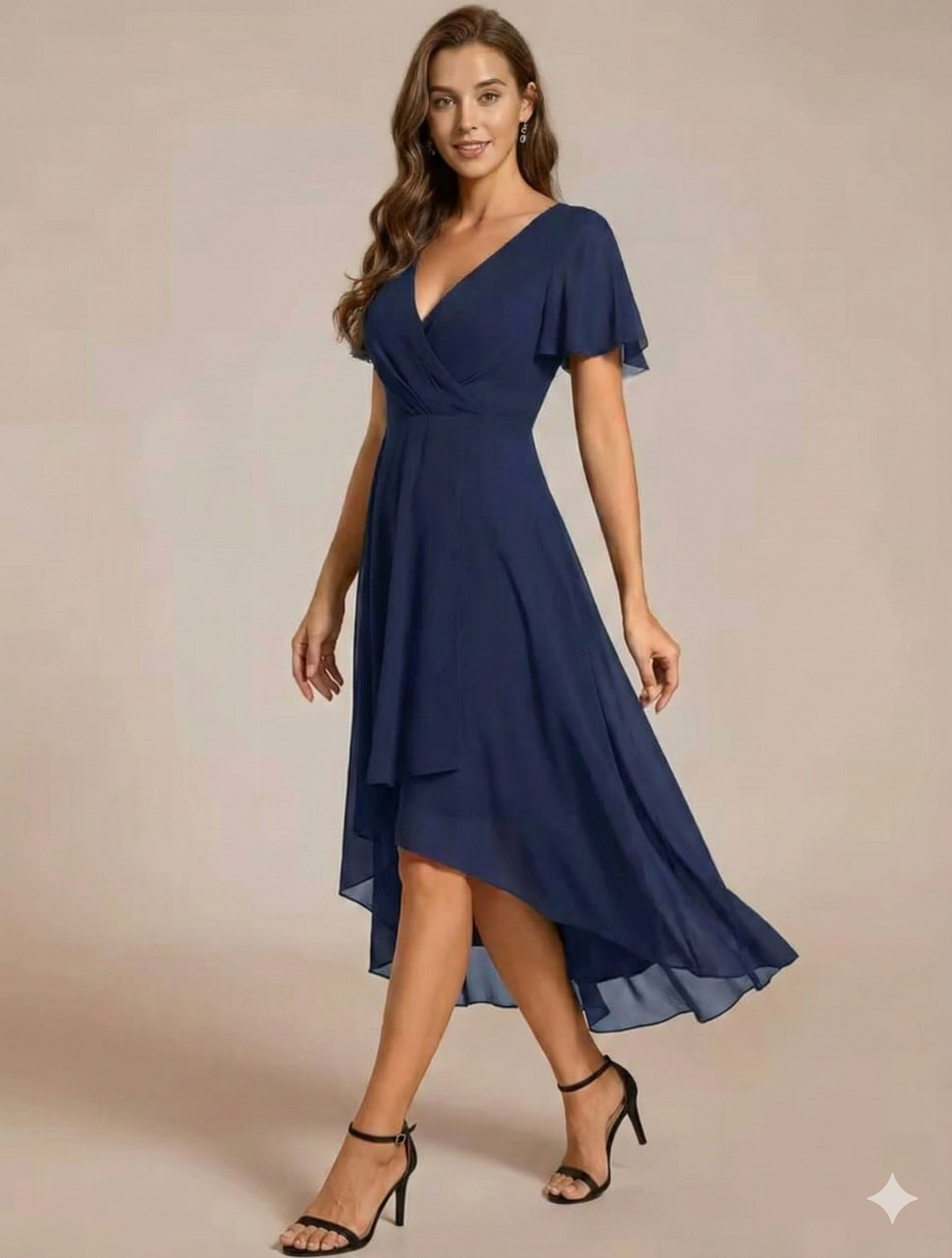 Découvrez notre robe bleu marine intemporelle qui deviendra votre alliée pour toutes vos occasions spéciales. Son col en V flatteur met en valeur votre décolleté, tandis que ses manches bouffantes trois-quarts apportent une touche de sophistication. Le drapé asymétrique crée un effet cascade élégant qui sublime votre silhouette, tout en vous offrant une liberté de mouvement grâce à sa mousseline fluide d'une qualité exceptionnelle.
